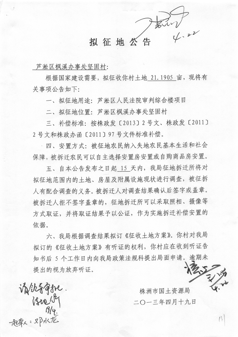 拟征地公告(芦淞区人民法院审判综合楼21.1905亩)
