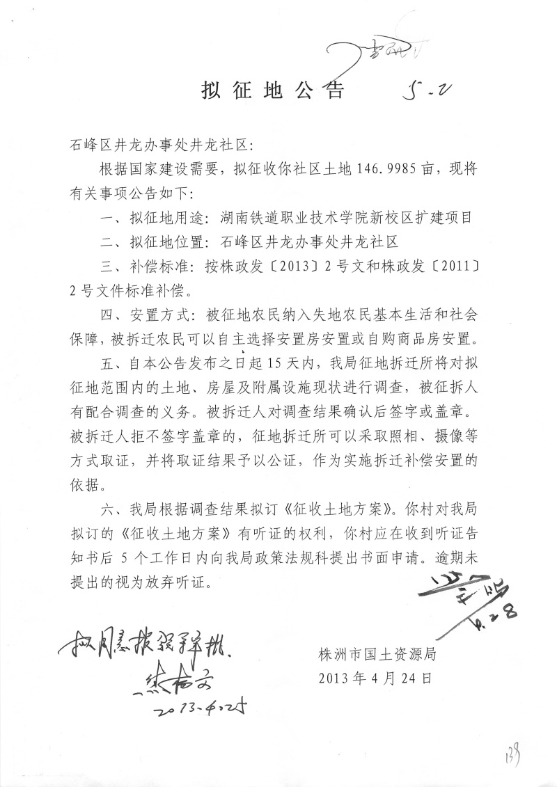 拟征地公告(湖南铁道职业技术学院新校区扩建146.9985亩)