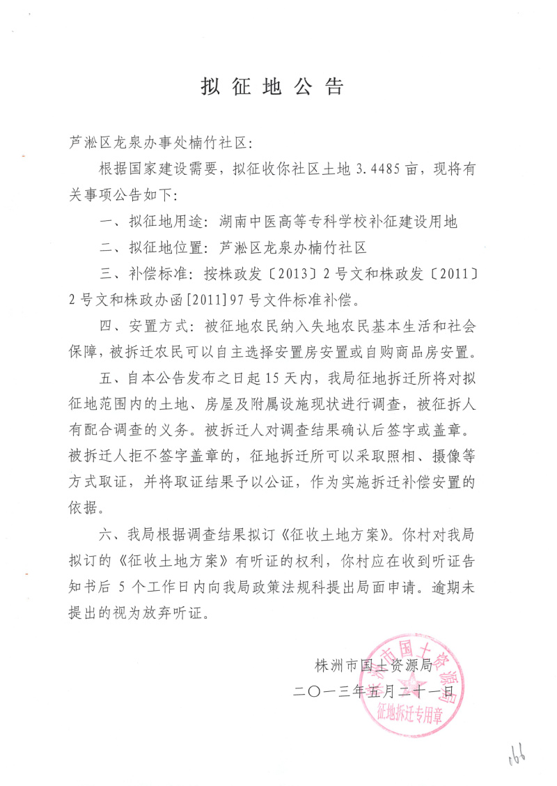 拟征地公告(湖南中医高等专科学校补征3.4485亩)