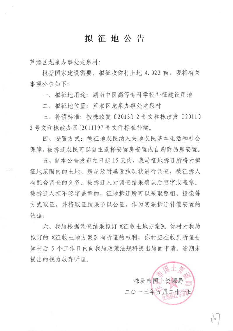 拟征地公告(湖南中医高等专科学校补征4.023亩)