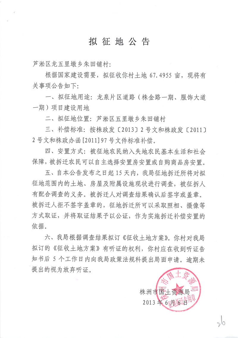 拟征地公告(龙泉片区道路株金路一期、服饰大道一期67.4955亩)