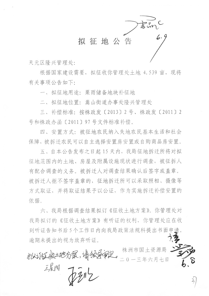 拟征地公告(栗雨储备地块补征地4.539亩)