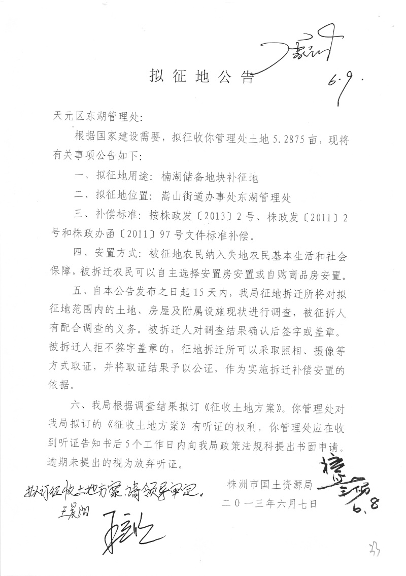 拟征地公告(楠湖储备地块补征地5.2875亩)