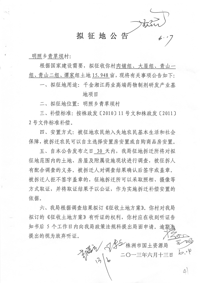 拟征地公告(千金湘江药业高端药物制剂研发产业基地15.948亩)