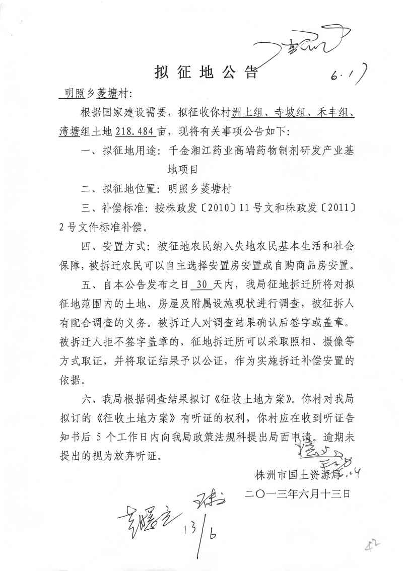 拟征地公告(千金湘江药业高端药物制剂研发产业基地218.484亩)