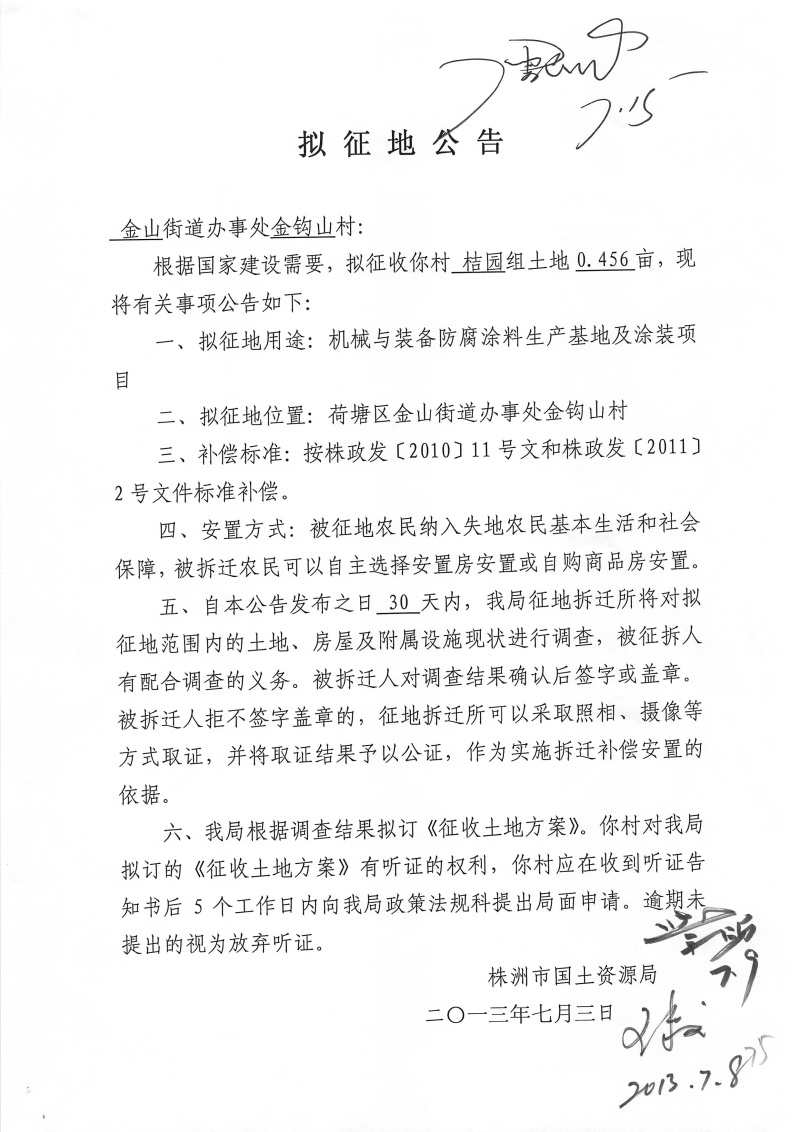 拟征地公告(机械与装备防腐涂料生产基地及涂装0.456亩)