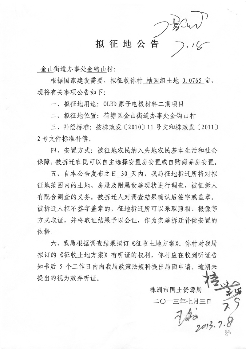 拟征地公告(OLED电子电极材料二期0.0765亩)