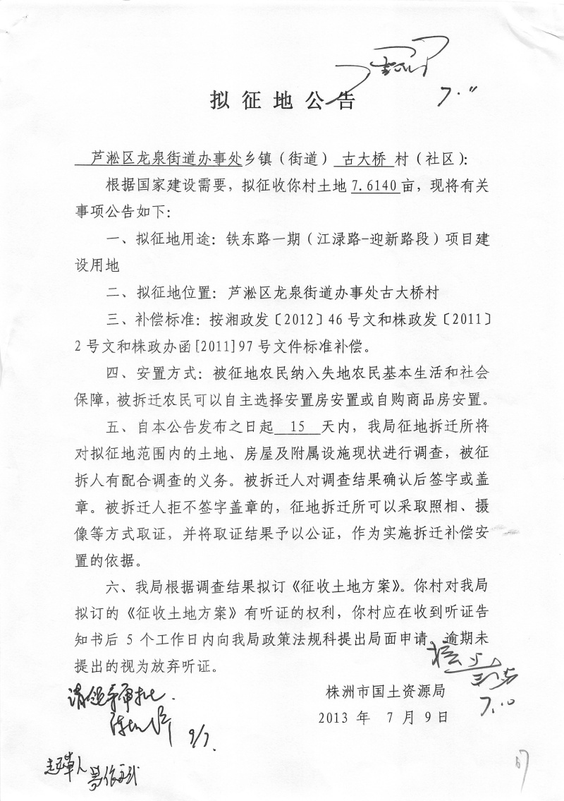 拟征地公告(铁东路一期江渌路—迎新路段7.614亩)
