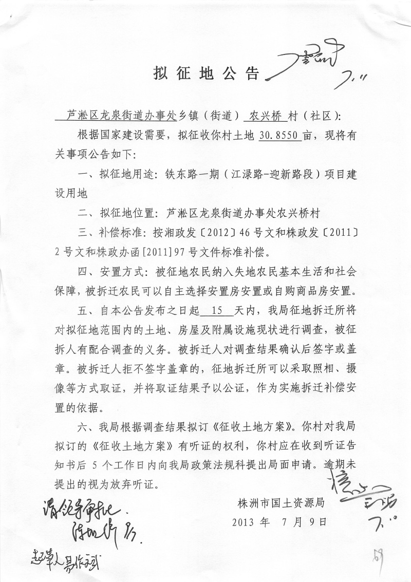 拟征地公告(铁东路一期江渌路—迎新路段30.855亩)