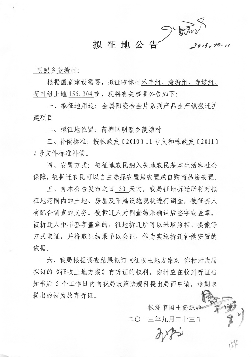 拟征地公告(金属陶瓷合金片系列产品生产线搬迁扩建155.304亩)