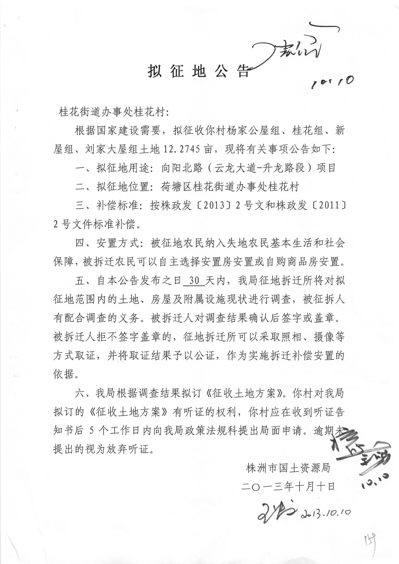 拟征地公告(向阳北路云龙大道—升龙路段12.2745亩)
