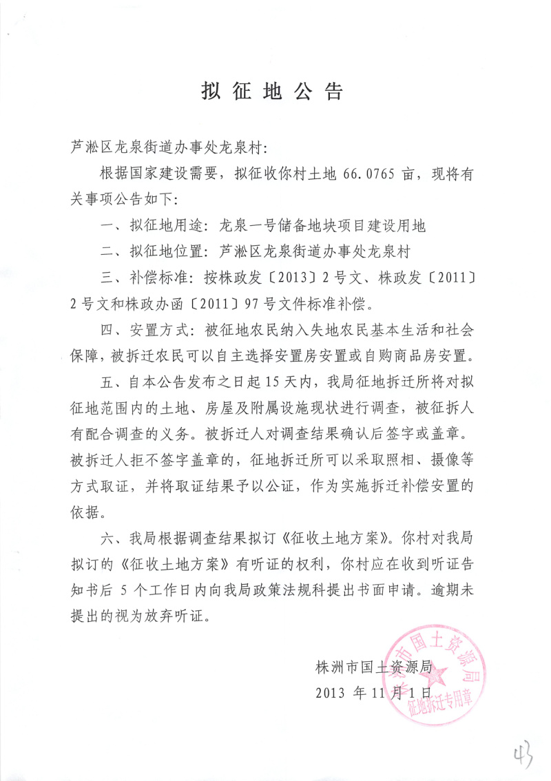 拟征地公告(龙泉一号储备地块66.0765亩)