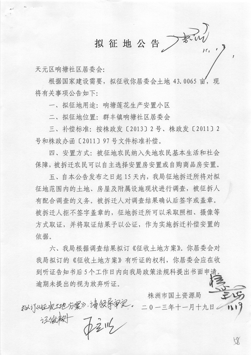 拟征地公告(响塘莲花生产安置小区43.0065亩)