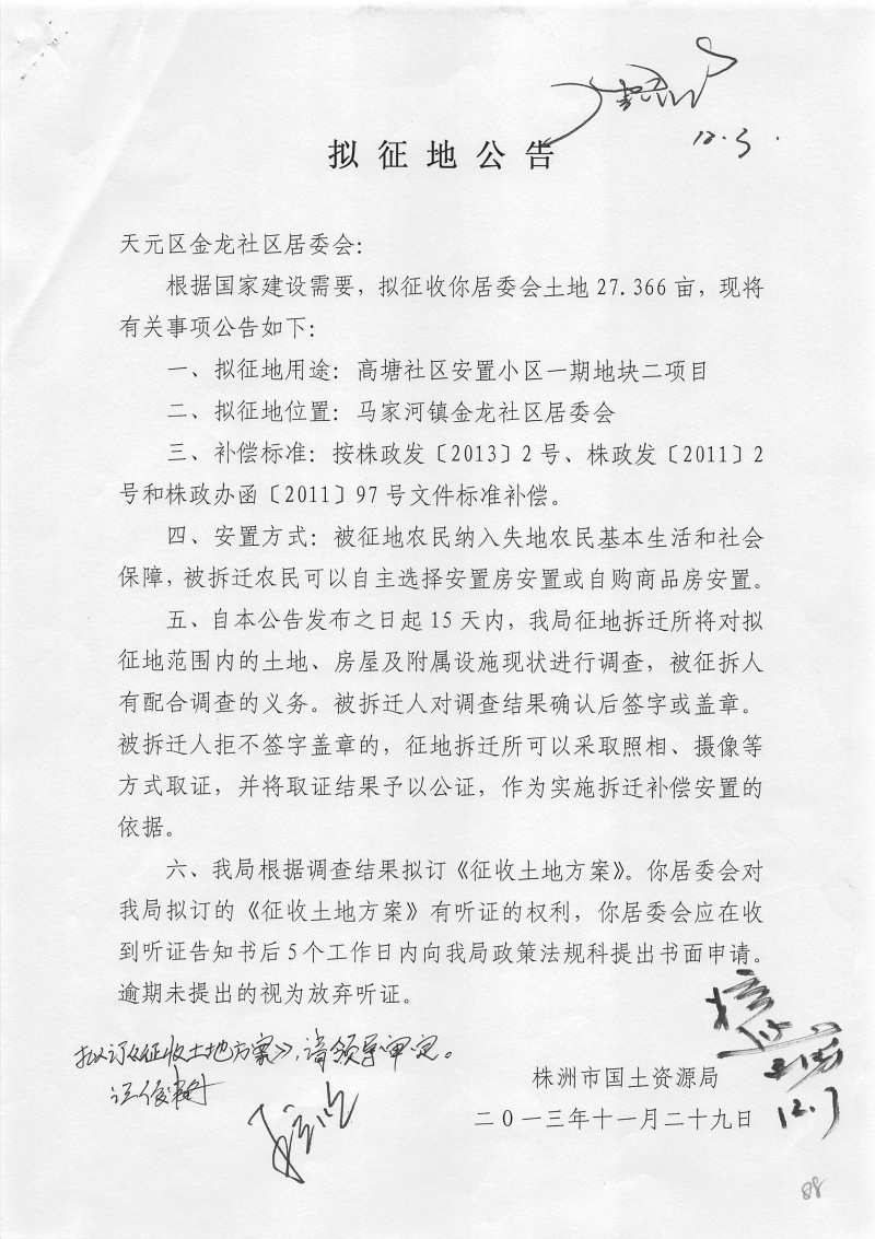 拟征地公告(高塘社区安置小区一期地块二27.366亩)