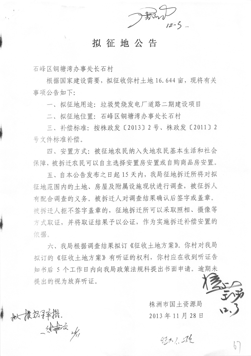 拟征地公告(垃圾焚烧发电厂道路二期16.644亩)