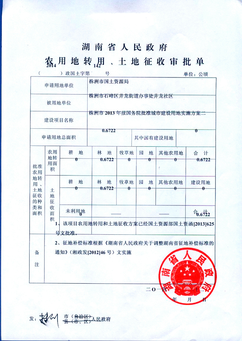 省政府农用地转用、土地征收审批单(2014)政国土字第142号