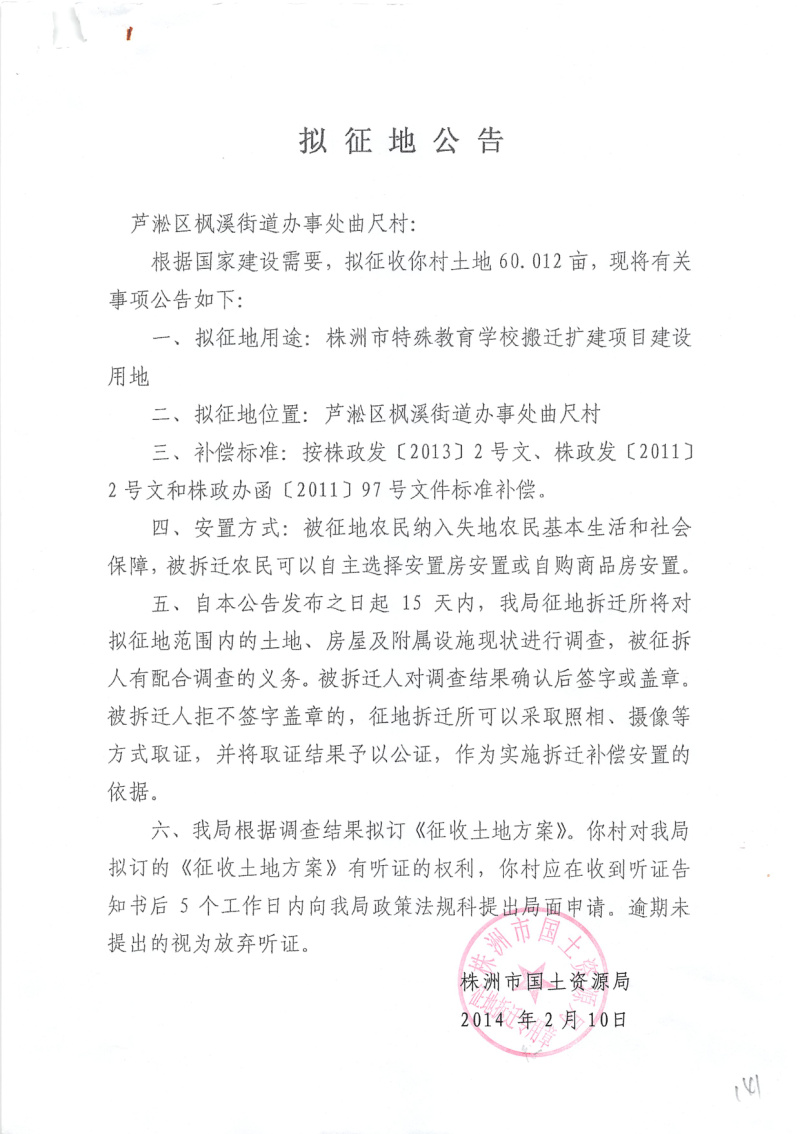 拟征地公告(特殊教育学校搬迁扩建60.012亩)