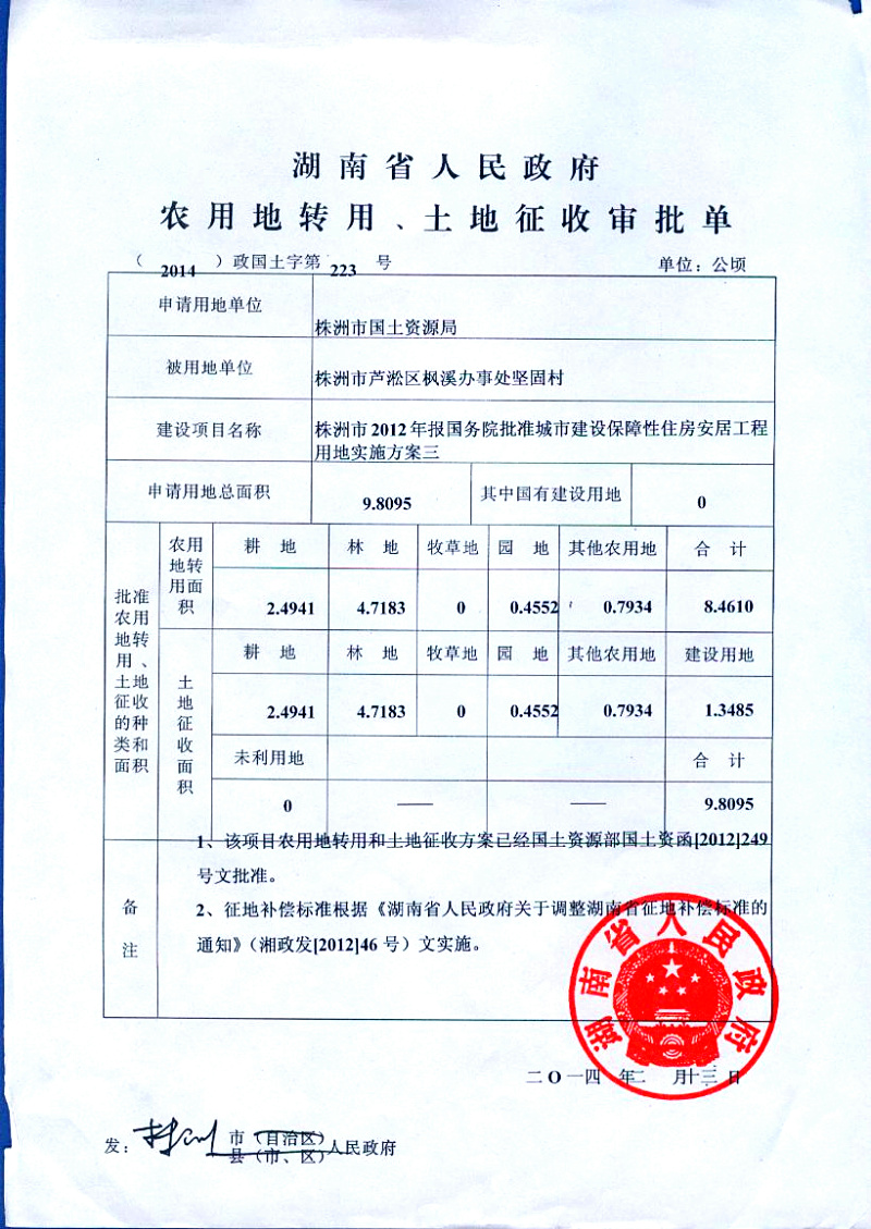 省政府农用地转用、土地征收审批单(2014)政国土字第223号