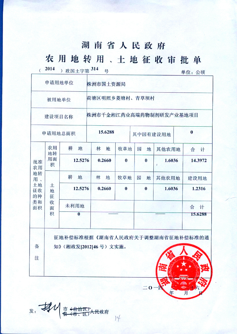 省政府农用地转用、土地征收审批单(2014)政国土字第314号