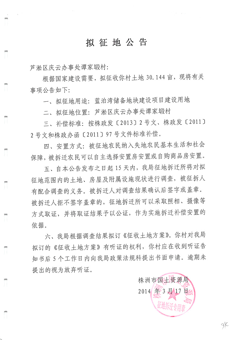 拟征地公告(蓝泊湾储备地块)谭家段村30.144亩