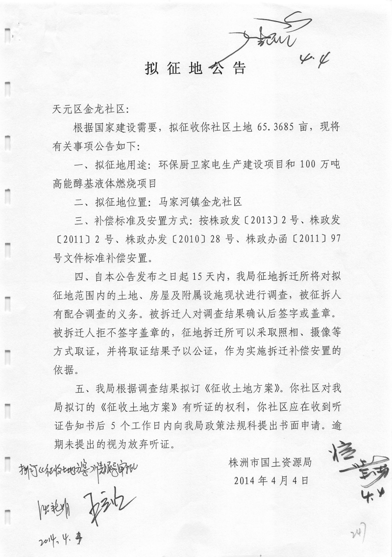 拟征地公告(环保厨卫家电生产建设和100万吨高能醇基液体燃烧项目金龙社区65.3685亩)