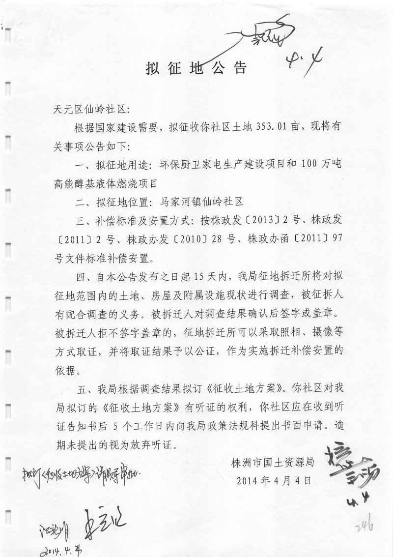 拟征地公告(环保厨卫家电生产建设和100万吨高能醇基液体燃烧项目仙岭社区353.01亩)