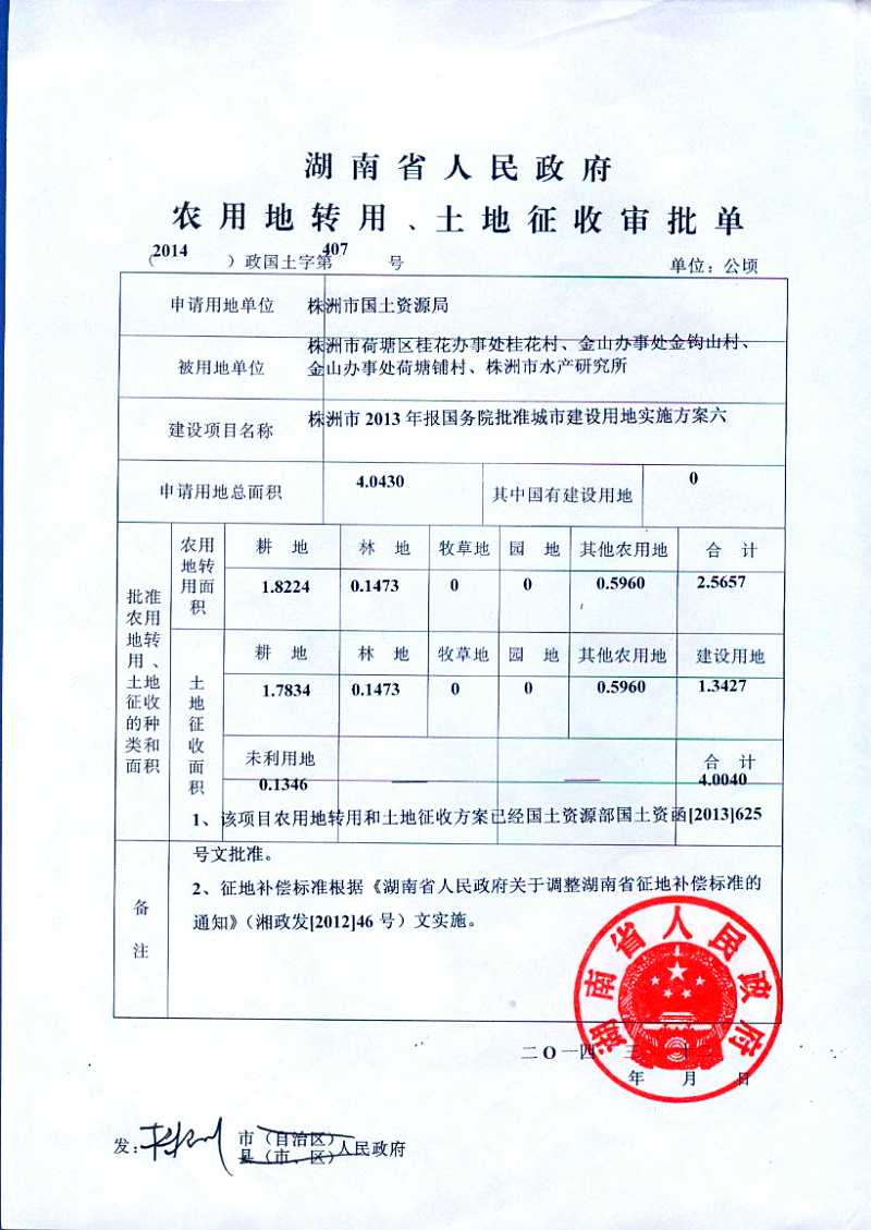 省政府农用地转用、土地征收审批单(2014)政国土字第407号