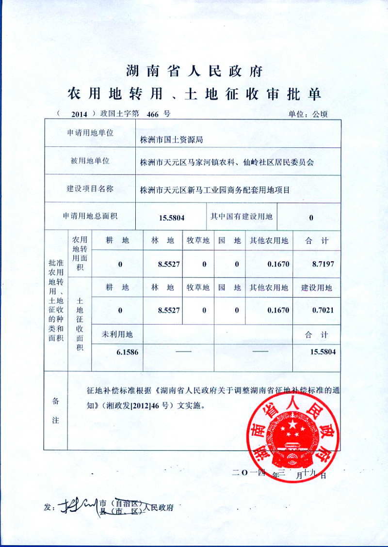 省政府农用地转用、土地征收审批单(2014)政国土字第466号