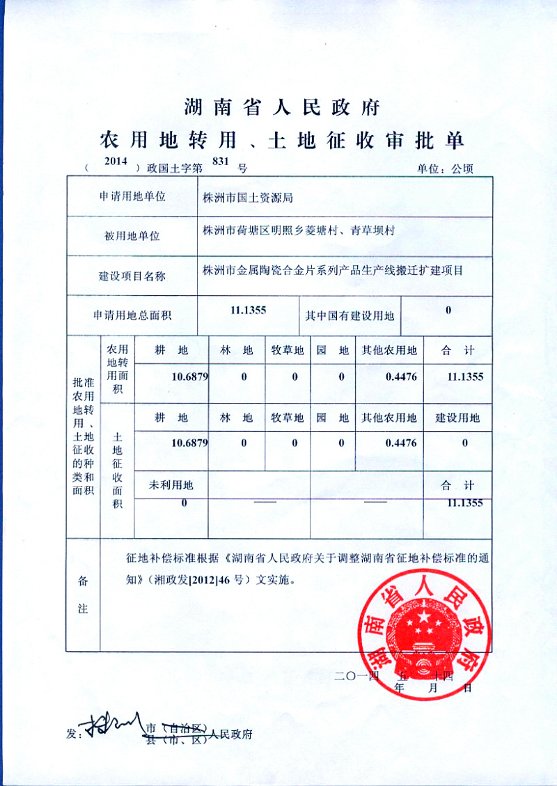省政府农用地转用、土地征收审批单(2014)政国土字第831号