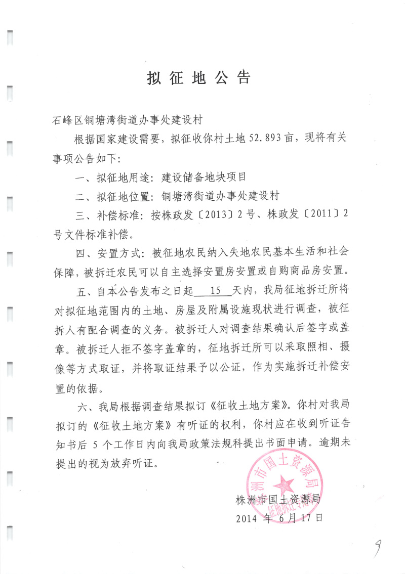 拟征地公告(储备地块铜塘湾街道办事处建设村52.893亩)