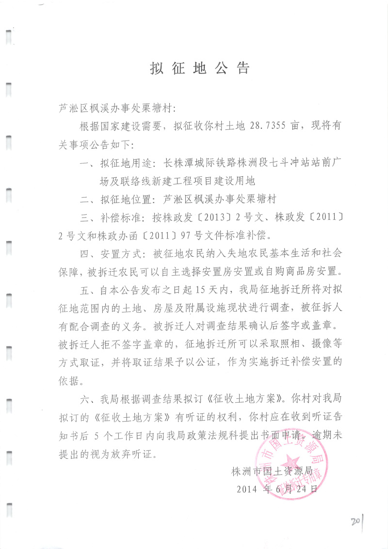 拟征地公告(长株潭城际铁路七斗冲站前广场及联络线新建工程28.7355亩)
