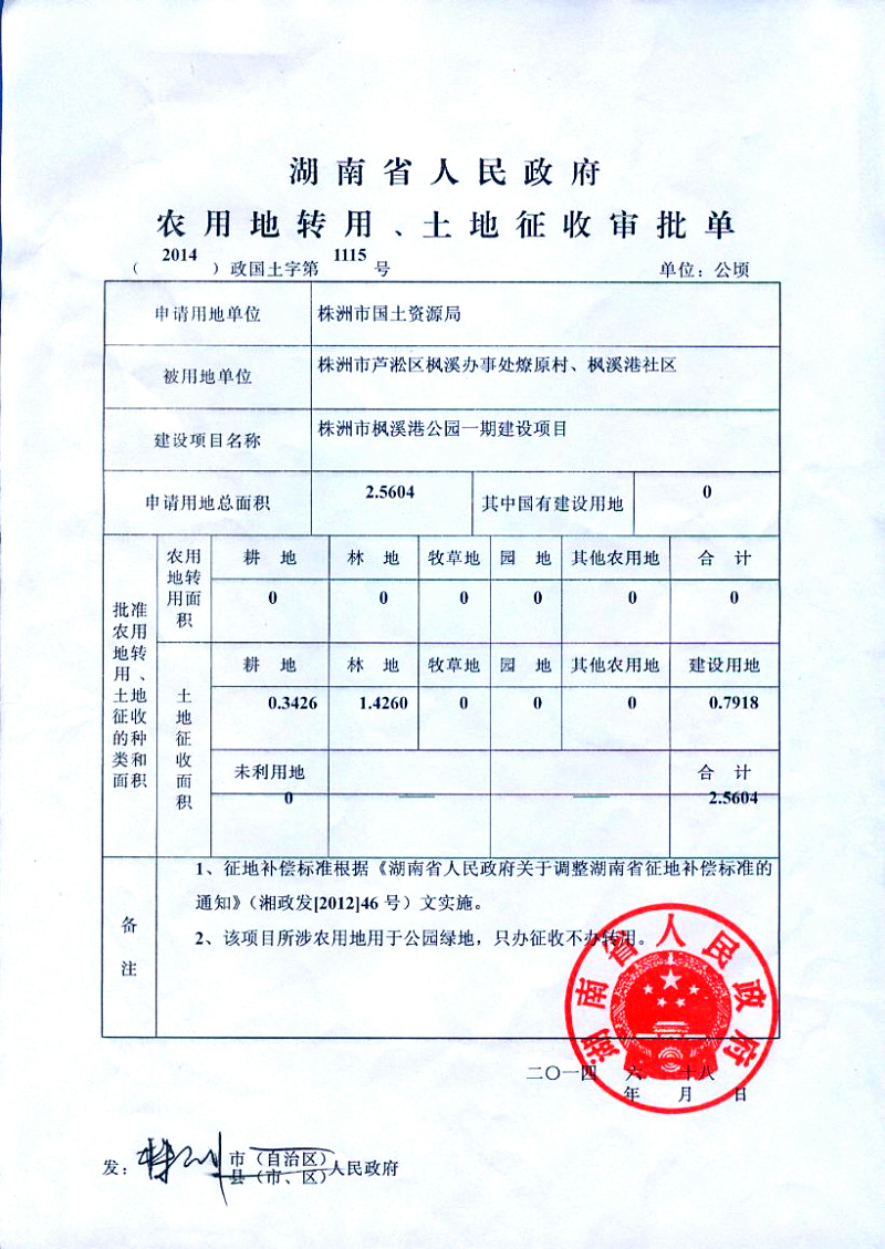 省政府农用地转用、土地征收审批单(2014)政国土字第1115号