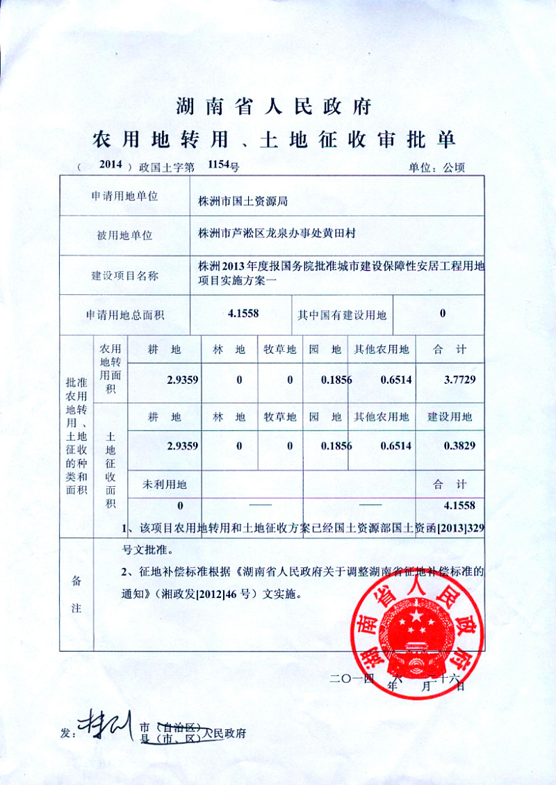 省政府农用地转用、土地征收审批单(2014)政国土字第1154号