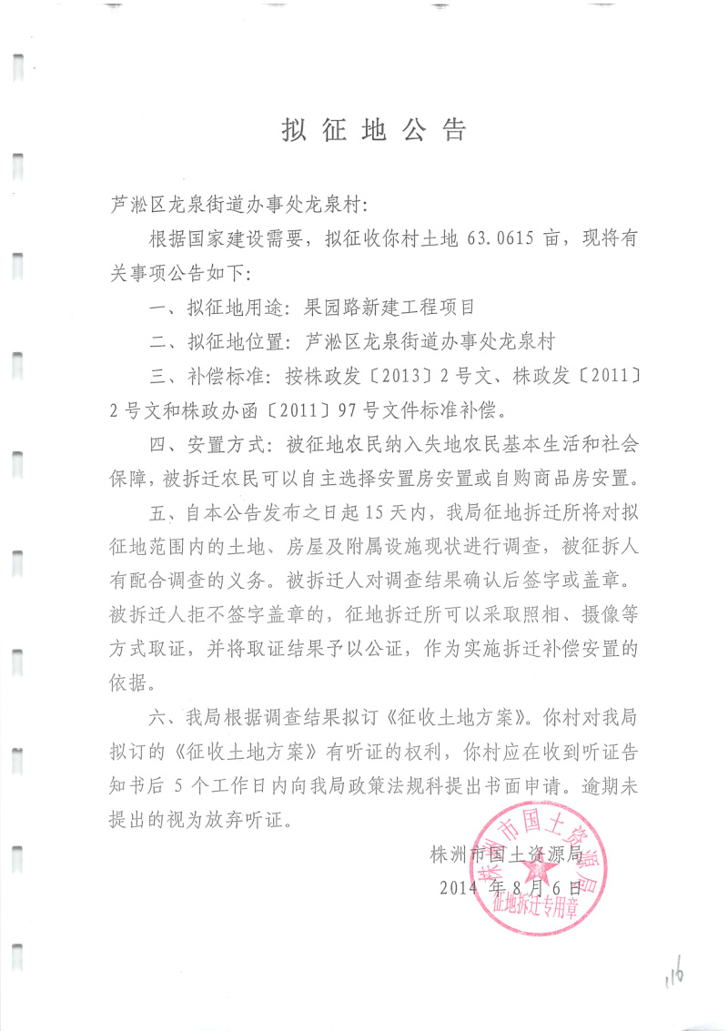 拟征地公告(果园路新建工程63.0615亩)