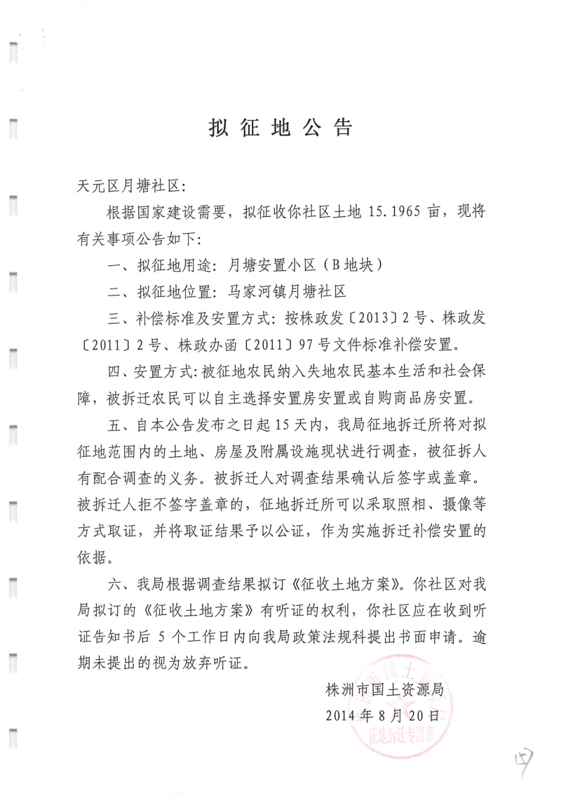 拟征地公告(月塘安置小区B地块15.1965亩)
