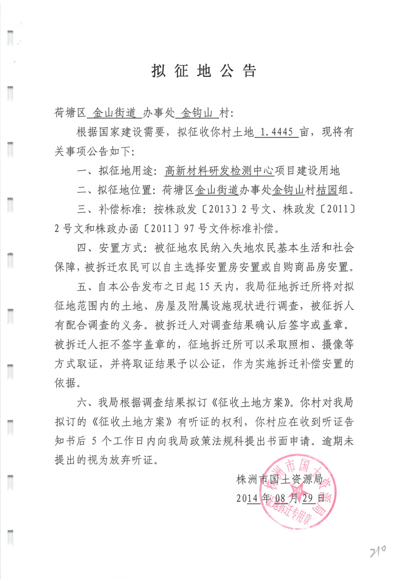拟征地公告(高新材料研发检测中心金钩山村1.4445亩)