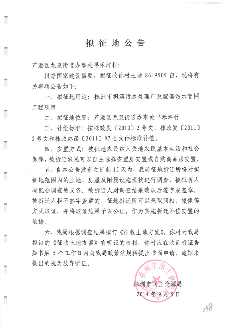 拟征地公告(枫溪污水处理厂及配套污水管网工程早禾坪村86.9505亩)