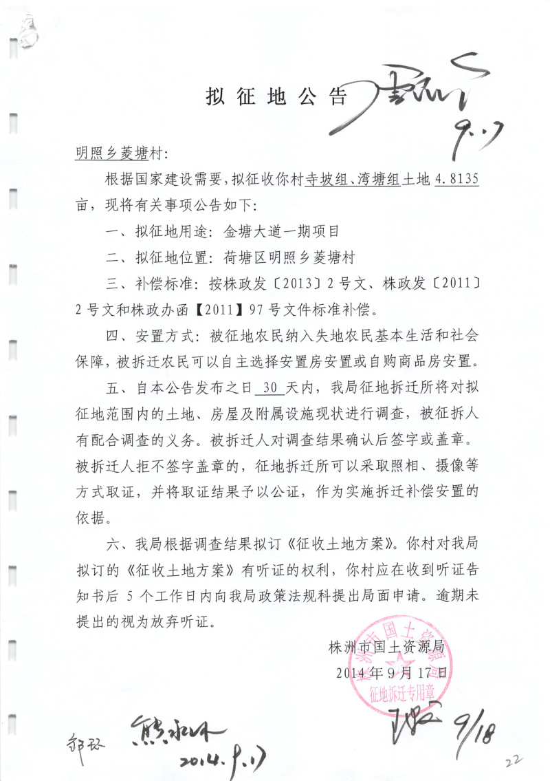 拟征地公告(金塘大道一期菱塘村4.8135亩)