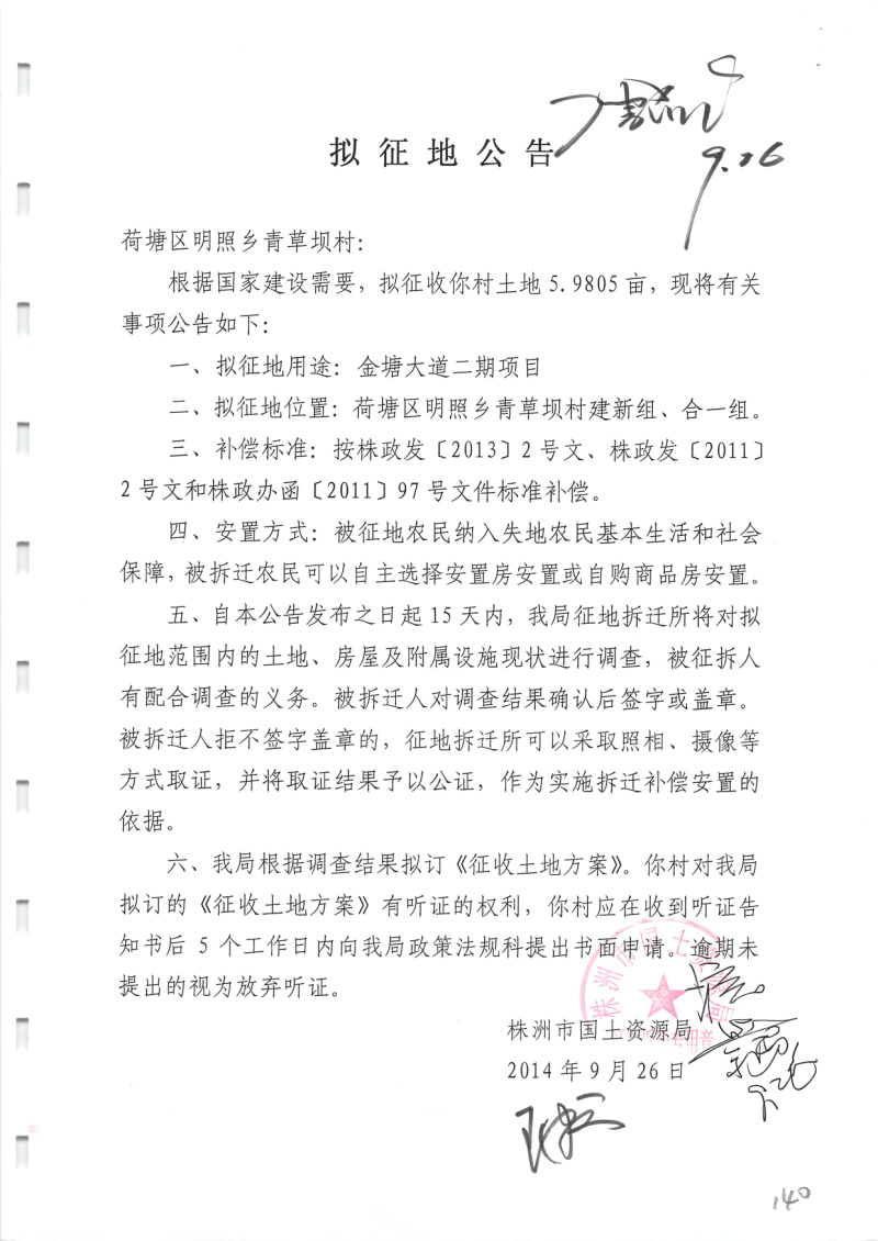 拟征地公告(金塘大道二期青草坝村5.9805亩)