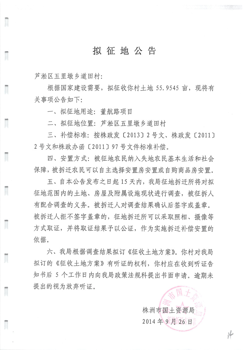 拟征地公告(董航路道田村55.9545亩)