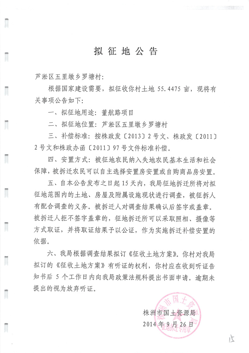 拟征地公告(董航路罗塘村55.4475亩)