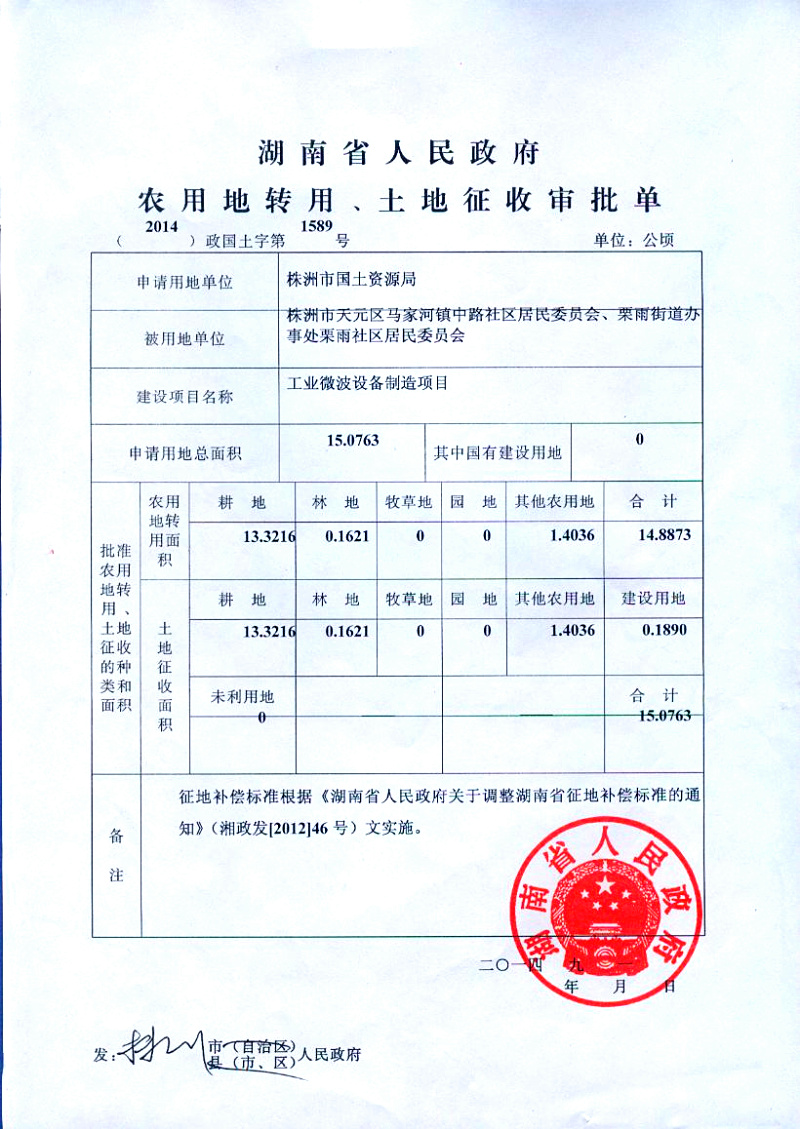 省政府农用地转用、土地征收审批单(2014)政国土字第1589号