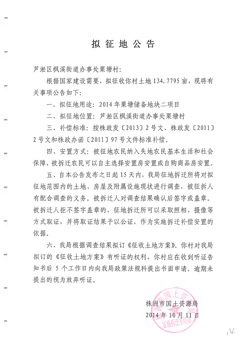 拟征地公告(2014年栗塘储备地块二)栗塘村134.7795亩