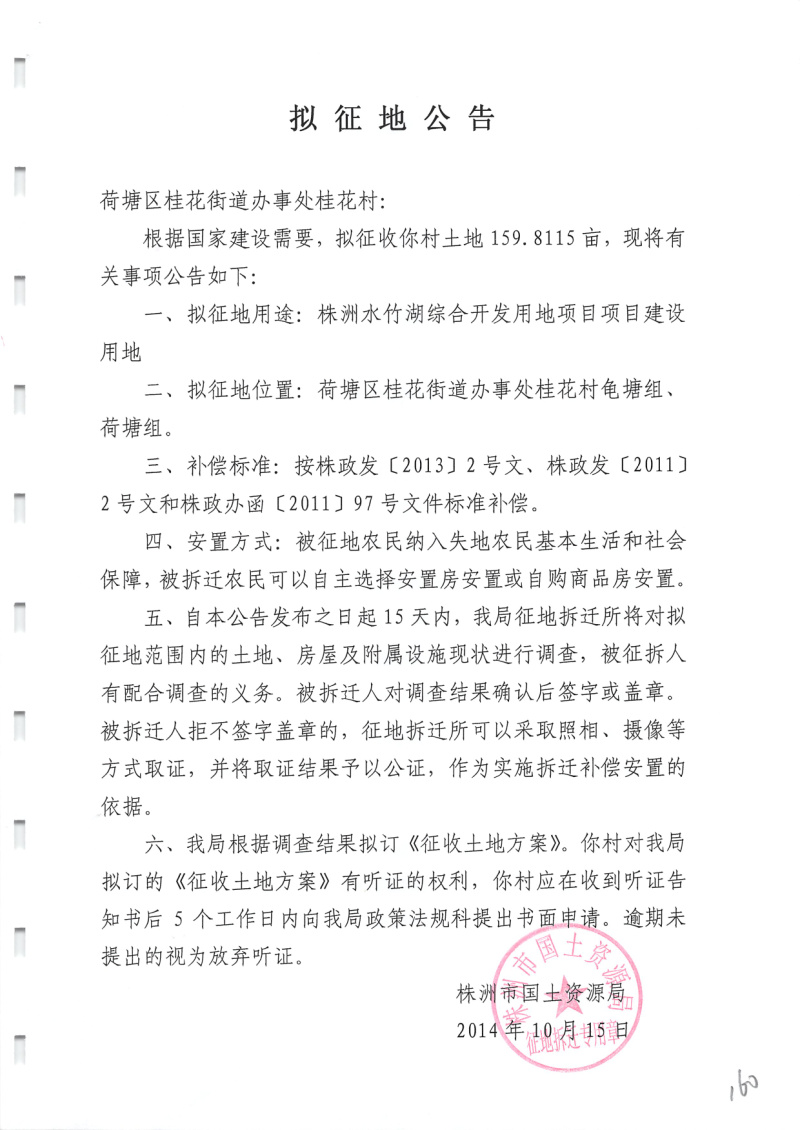 拟征地公告(水竹湖综合开发用地项目159.8115亩)