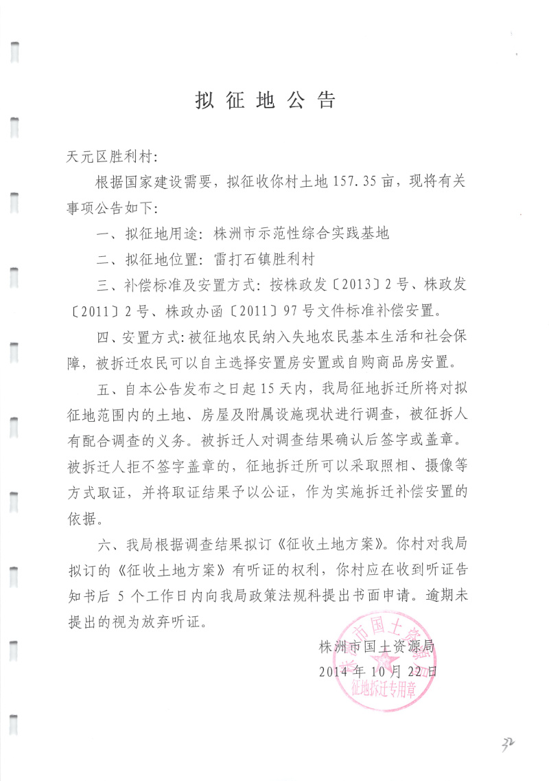 拟征地公告(株洲市示范性综合实践基地157.35亩)