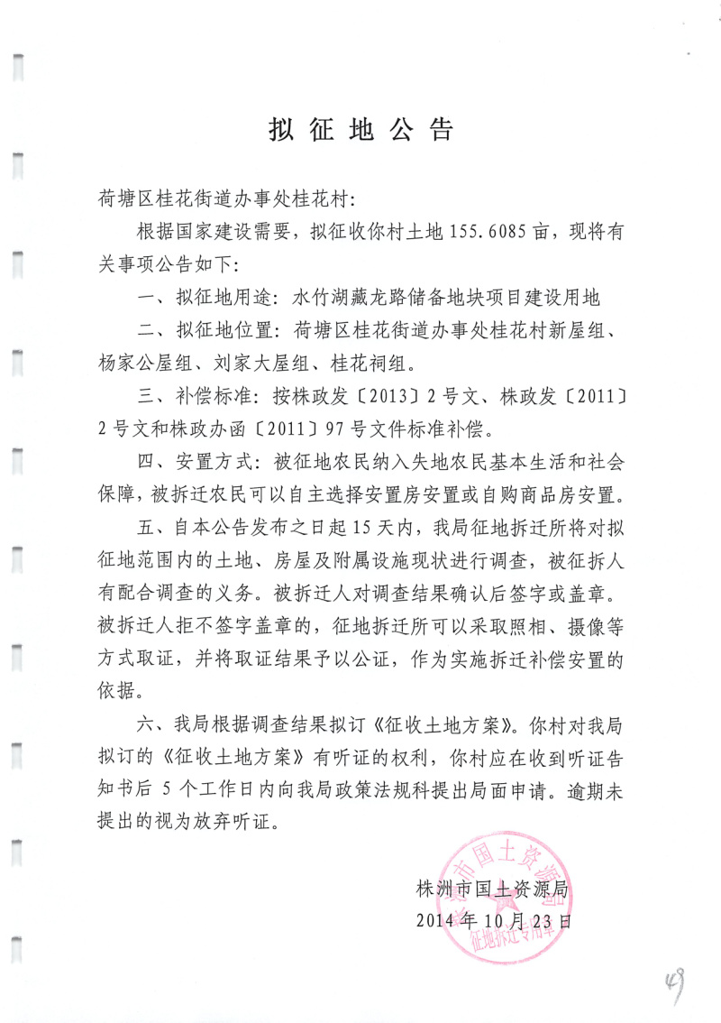 拟征地公告(水竹湖藏龙路储备地块155.6085亩)