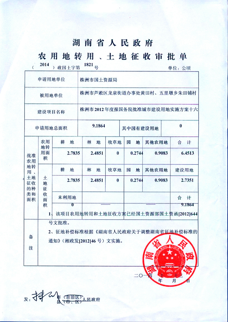 省政府农用地转用、土地征收审批单(2014)政国土字第1821号