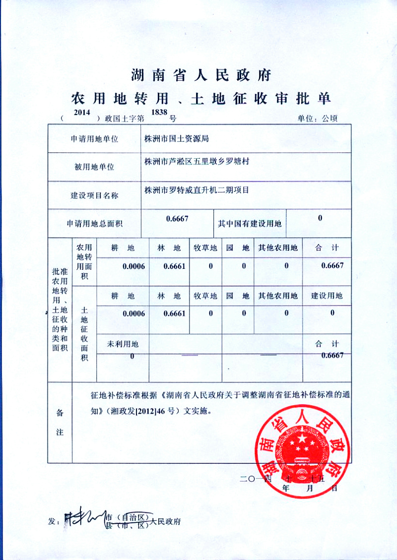 省政府农用地转用、土地征收审批单(2014)政国土字第1838号