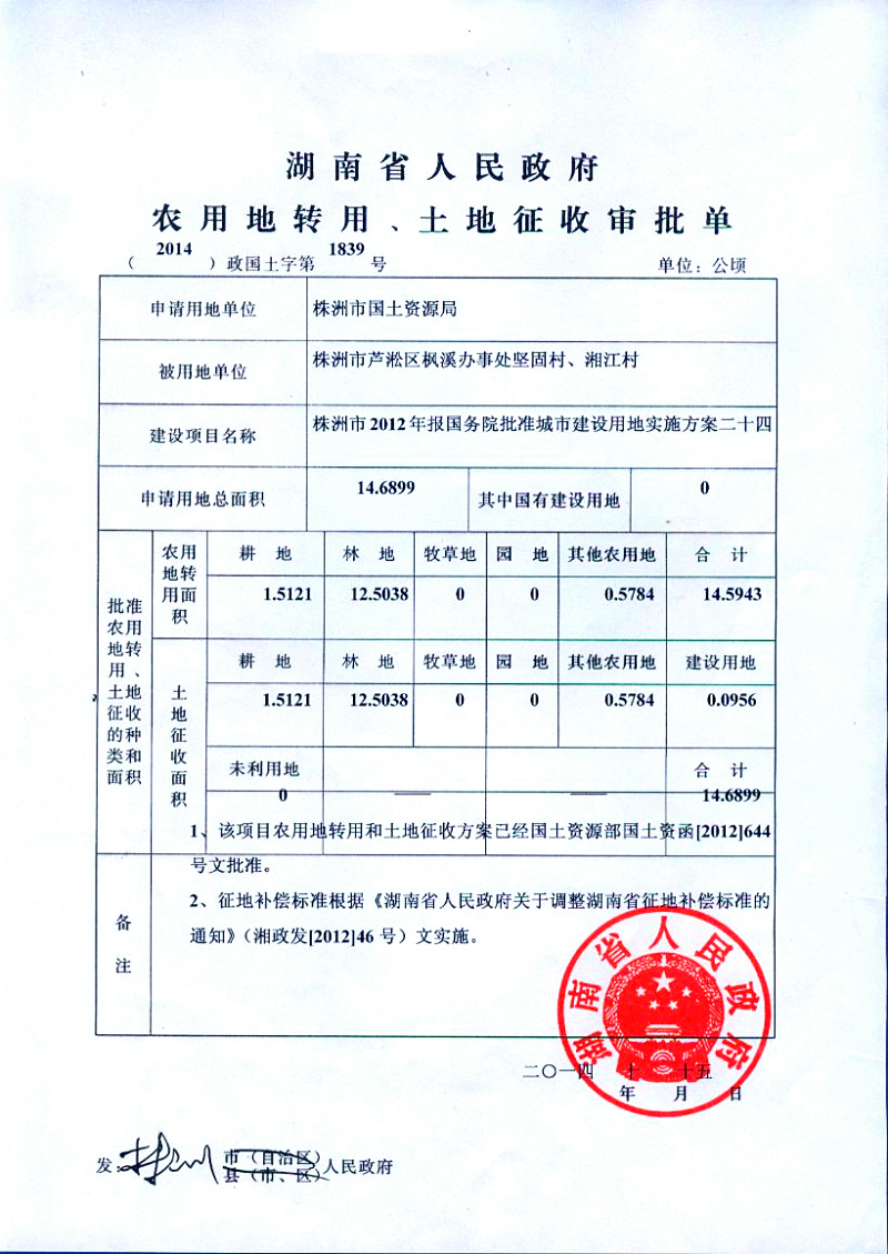 省政府农用地转用、土地征收审批单(2014)政国土字第1839号