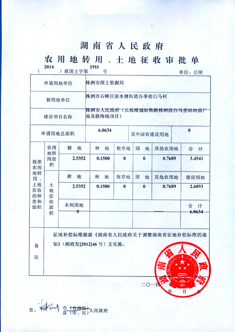 省政府农用地转用、土地征收审批单(2014)政国土字第1911号
